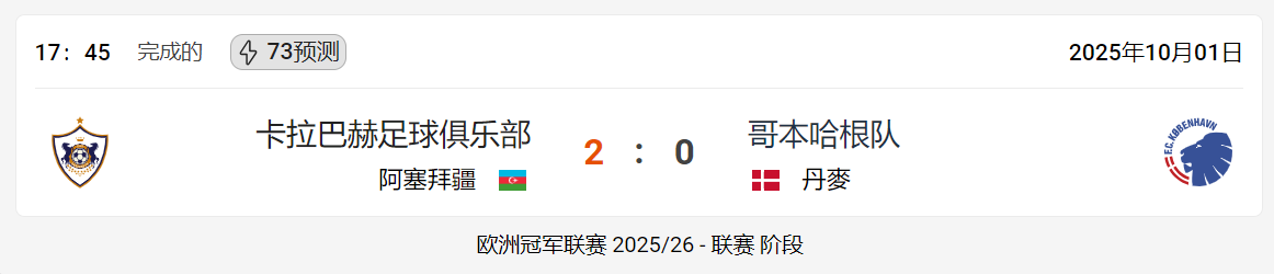 newbb下载官网 2025年10月01日卡拉巴赫足球俱乐部哥本哈根队:足球比赛概述与实时更新 卡拉巴赫足球俱乐部 (阿塞拜疆) 与 哥本哈根队 (丹麥) 之间的足球比赛于星期三 2025年10月01日 在 17:45 结束,比分为2 : 0,有利于 卡拉巴赫足球俱乐部。这场比赛是 联赛 阶段 的一部分欧洲冠军联赛 2025/26。 由于比赛已经结束,因此卡拉巴赫足球俱乐部对阵哥本哈根队的投注已不再接受和可用。