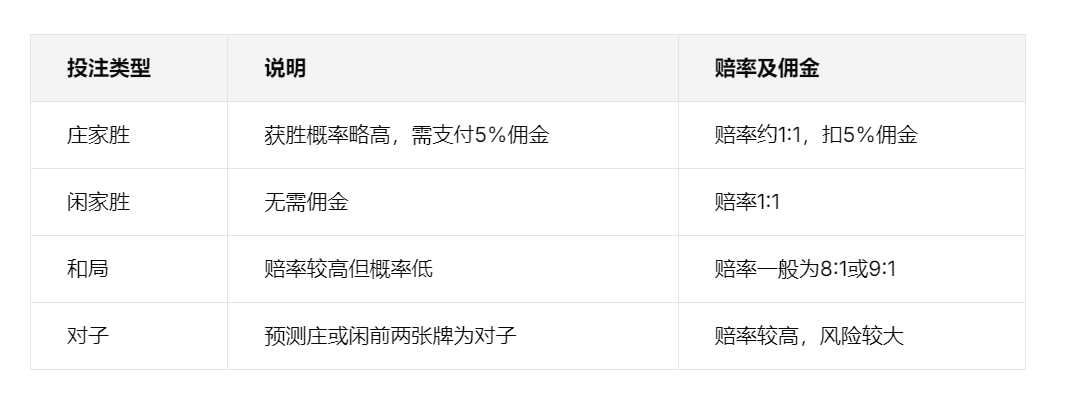投注选项:庄家(Banker)、闲家(Player)、和局(Tie)。