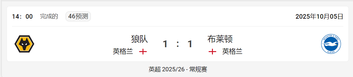 赛事报道 2025年10月05日狼队布莱顿:足球比赛概述与实时更新 常规赛 英超 2025/26 中 狼队 (英格兰) 和 布莱顿 (英格兰) 之间的足球比赛于 星期日 2025年10月05日 结束,时间为 14:00。比赛以 1 : 1 的比分打成平局。 由于比赛已经结束,因此狼队对阵布莱顿的投注已不再接受和可用。