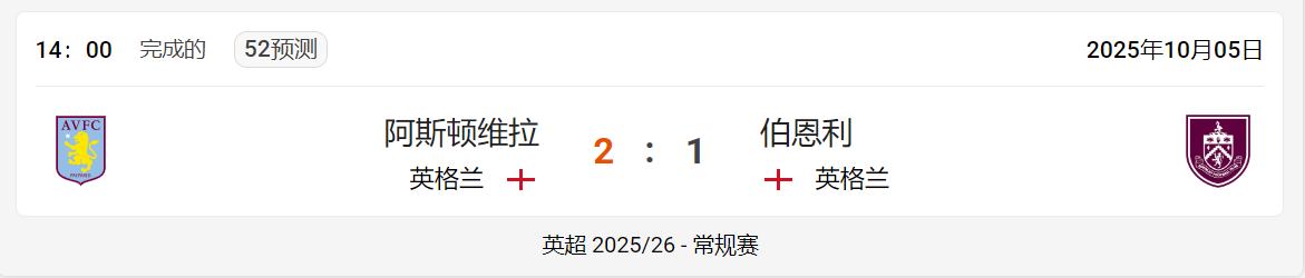 赛事报道 2025年10月05日阿斯顿维拉伯恩利:足球比赛概述与实时更新 阿斯顿维拉 (英格兰) 与 伯恩利 (英格兰) 之间的足球比赛于星期日 2025年10月05日 在 14:00 结束,比分为2 : 1,有利于 阿斯顿维拉。这场比赛是 常规赛 的一部分英超 2025/26。 由于比赛已经结束,因此阿斯顿维拉对阵伯恩利的投注已不再接受和可用。