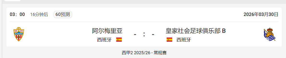 常规赛阶段的西甲2 2025/26即将开始,又将有一场足球比赛。阿尔梅里亚 (西班牙)对阵皇家社会足球俱乐部 B (西班牙)定于星期一 2026年03月30日进行,所以记得在03:00调整频道。